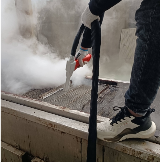 在干冰清洗过程中,空气压缩被用作动力。在清洗过程中,干冰颗粒以极高的速度喷射到被清洗物体的表面,但这不仅仅是依靠干冰颗粒产生的动力,而是利用干冰的超低温特性来达到污染处理的目的。